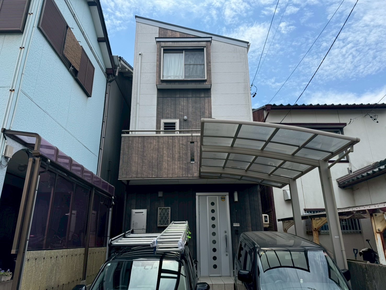 外壁塗装:シーカ・ジャパン(スーパーセランフレックス) メイン:(N-25) アクセント:正面2.3階ライン.玄関面外壁(N-10)